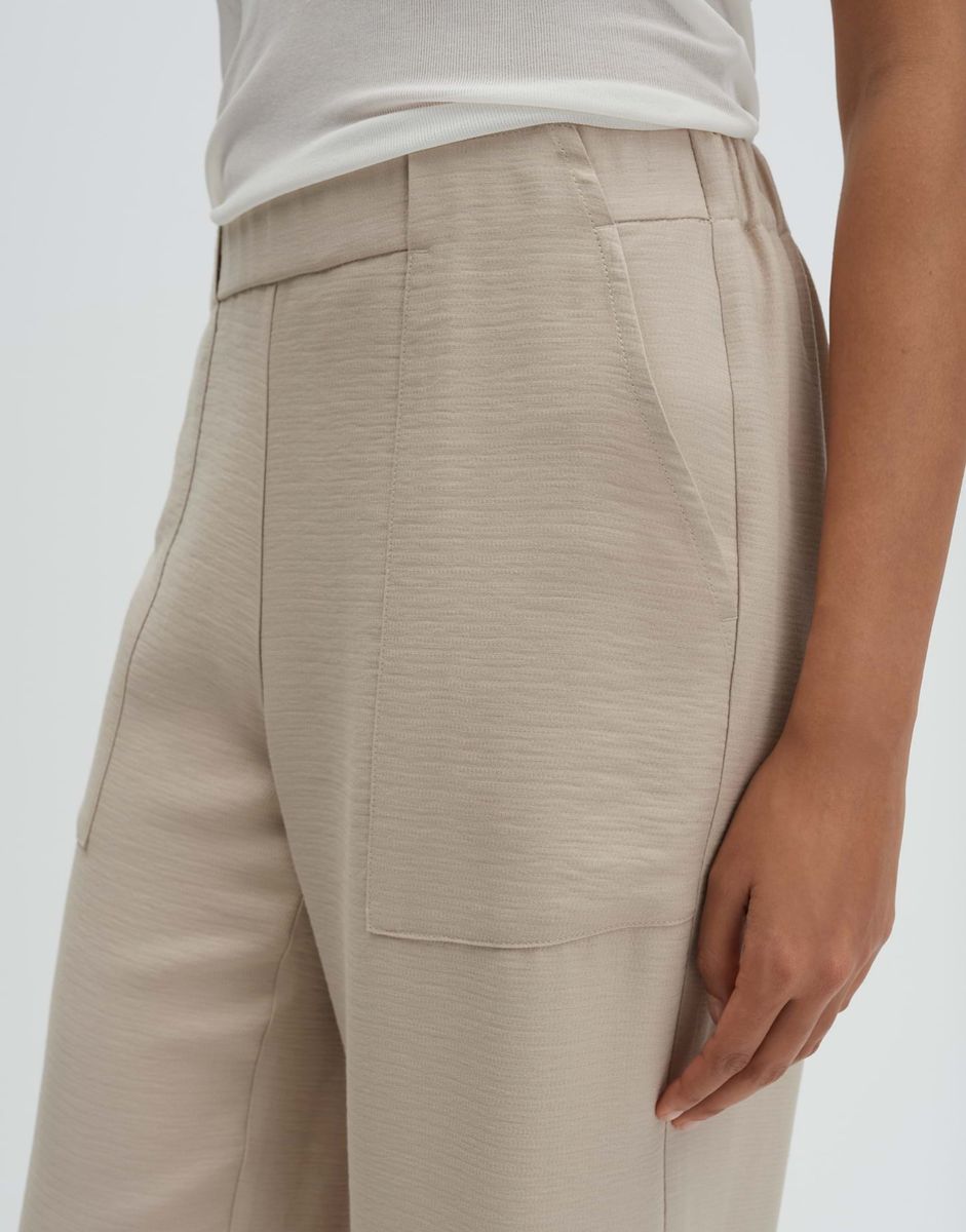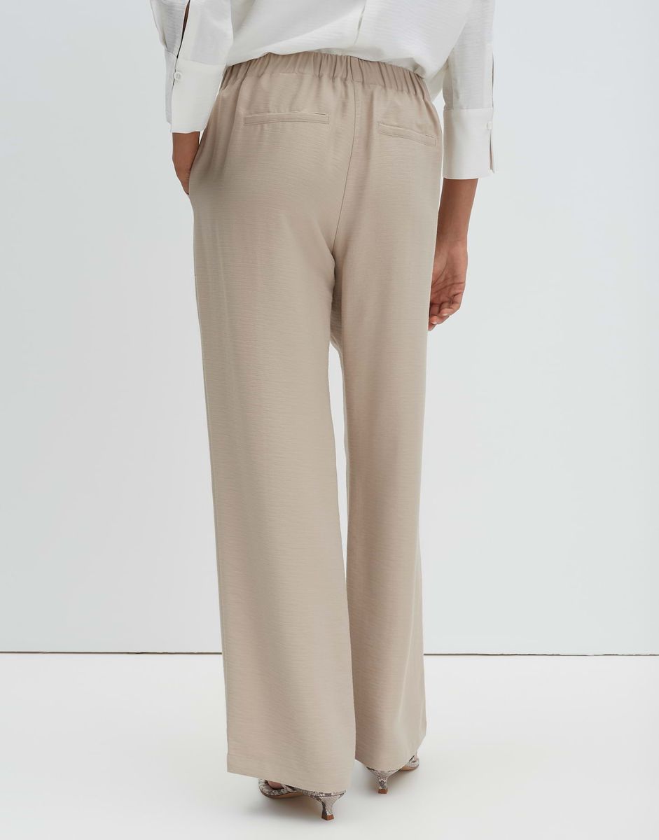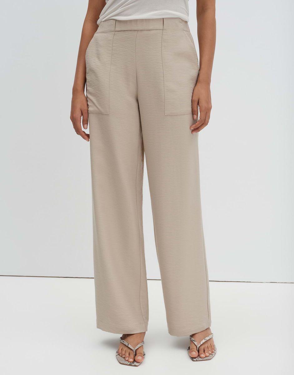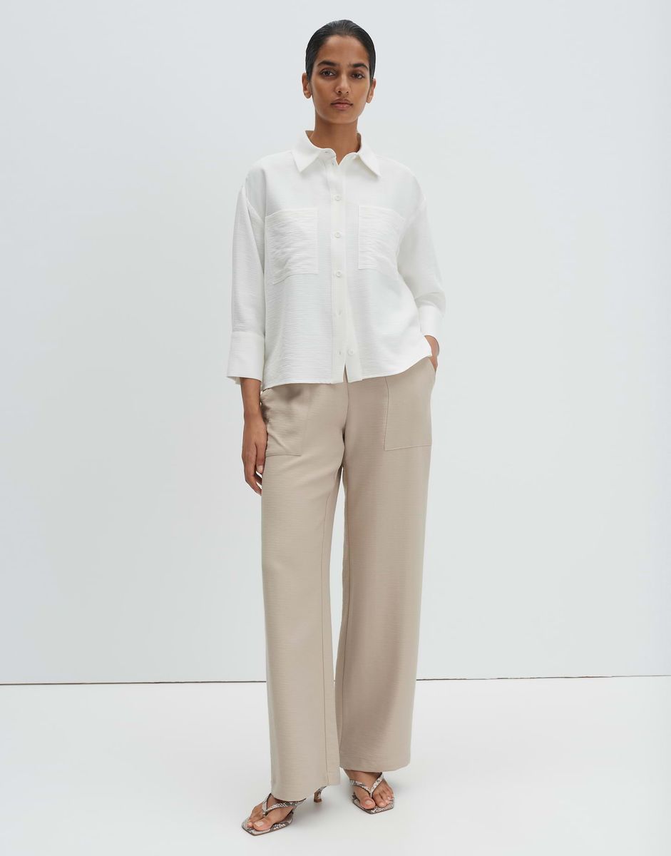 weiter, gerader Beinverlauf, Hosenbein Innenlänge ca. 78 cm in jeder Größe, Model Größe 173 cm – trägt Größe 36, Webware, bewegte Crinkle Struktur, natürlicher Griff, formstabil, pflegeleicht, aufgesetzte Cargotaschen, Zier-Paspeltaschen hinten, elastischer Gummibund
