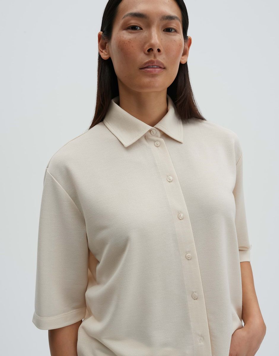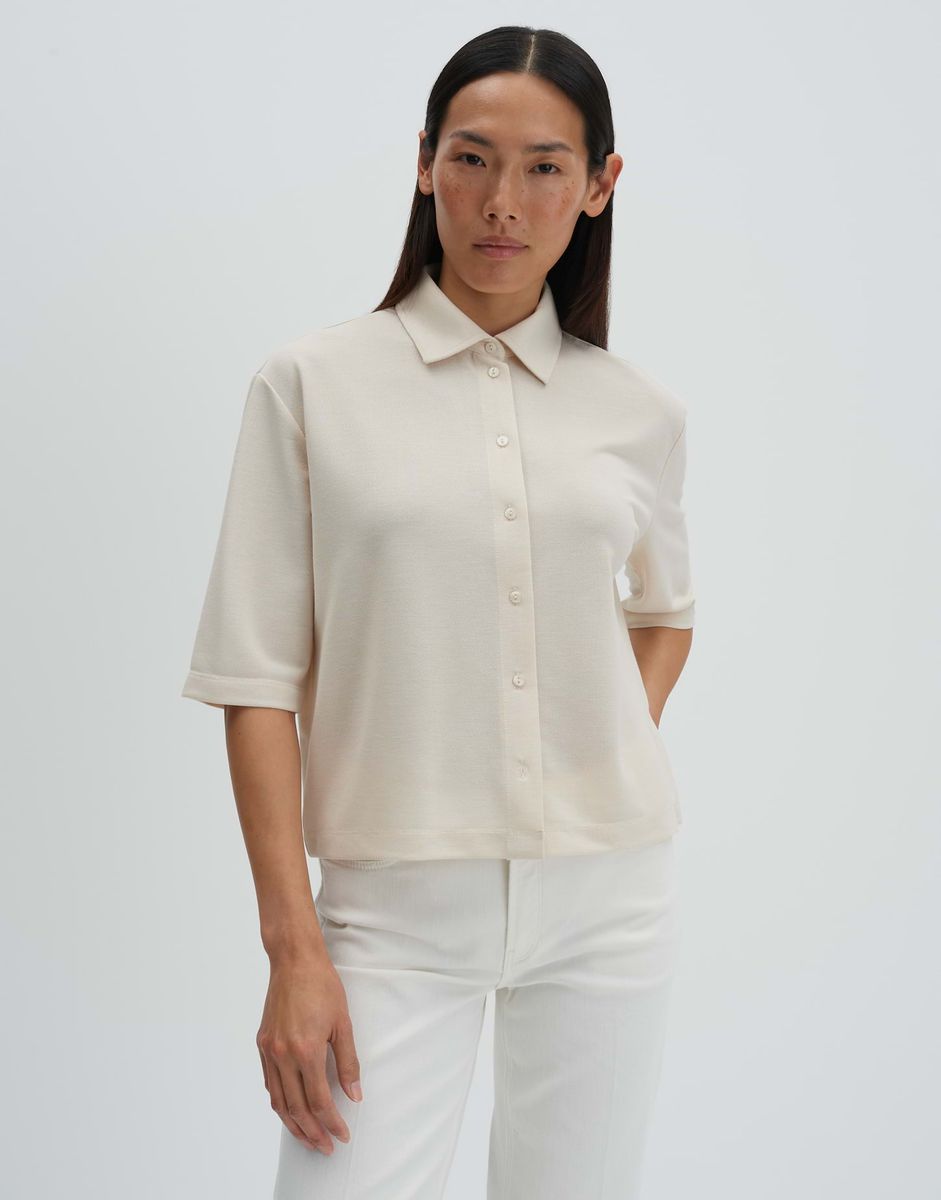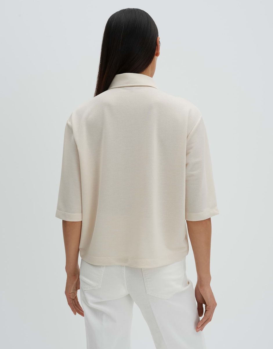weite Passform, Boxy Silhouette, leicht verkürzt geschnitten, überschnittene Schulter mit Kurzarm, Hemdblusenkragen, Rückenlänge ca. 55 cm bei Größe 36, Model Größe 175 cm – trägt Größe 36, Jersey, Strickoptik, weicher Griff, elastisch, Knopfleiste