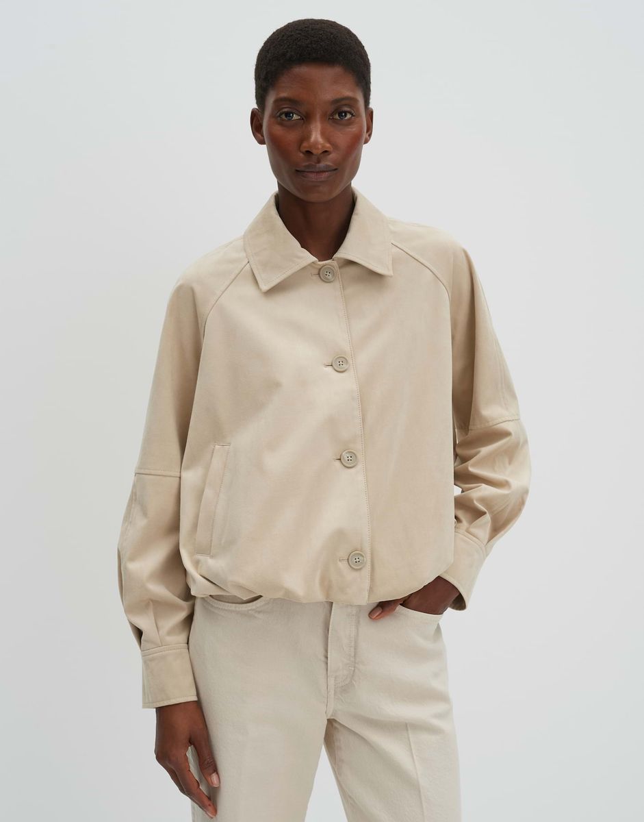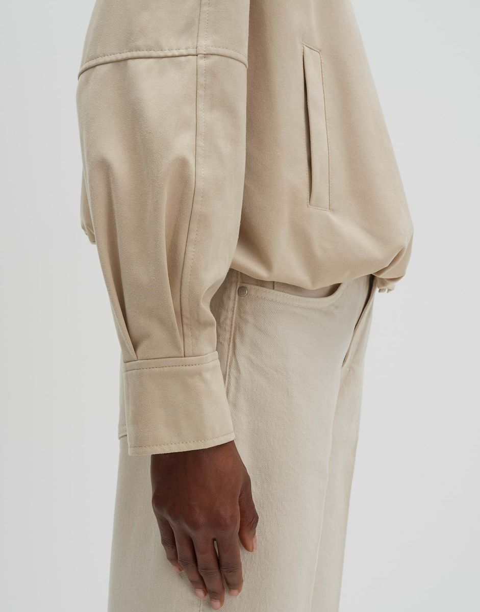 lockere Passform, ovaler Schnitt, verkürzte Länge, Langarm, Umlegekragen, Rückenlänge ca. 54 cm bei Größe 36, Model Größe 175 cm – trägt Größe 36, Velourslederimitat, glattes Innenfutter, fester Griff, samtige Oberfläche, schräge Eingrifftaschen, geraffter Ballonsaum, Knopfleiste, abgesteppte Teilungsnähte