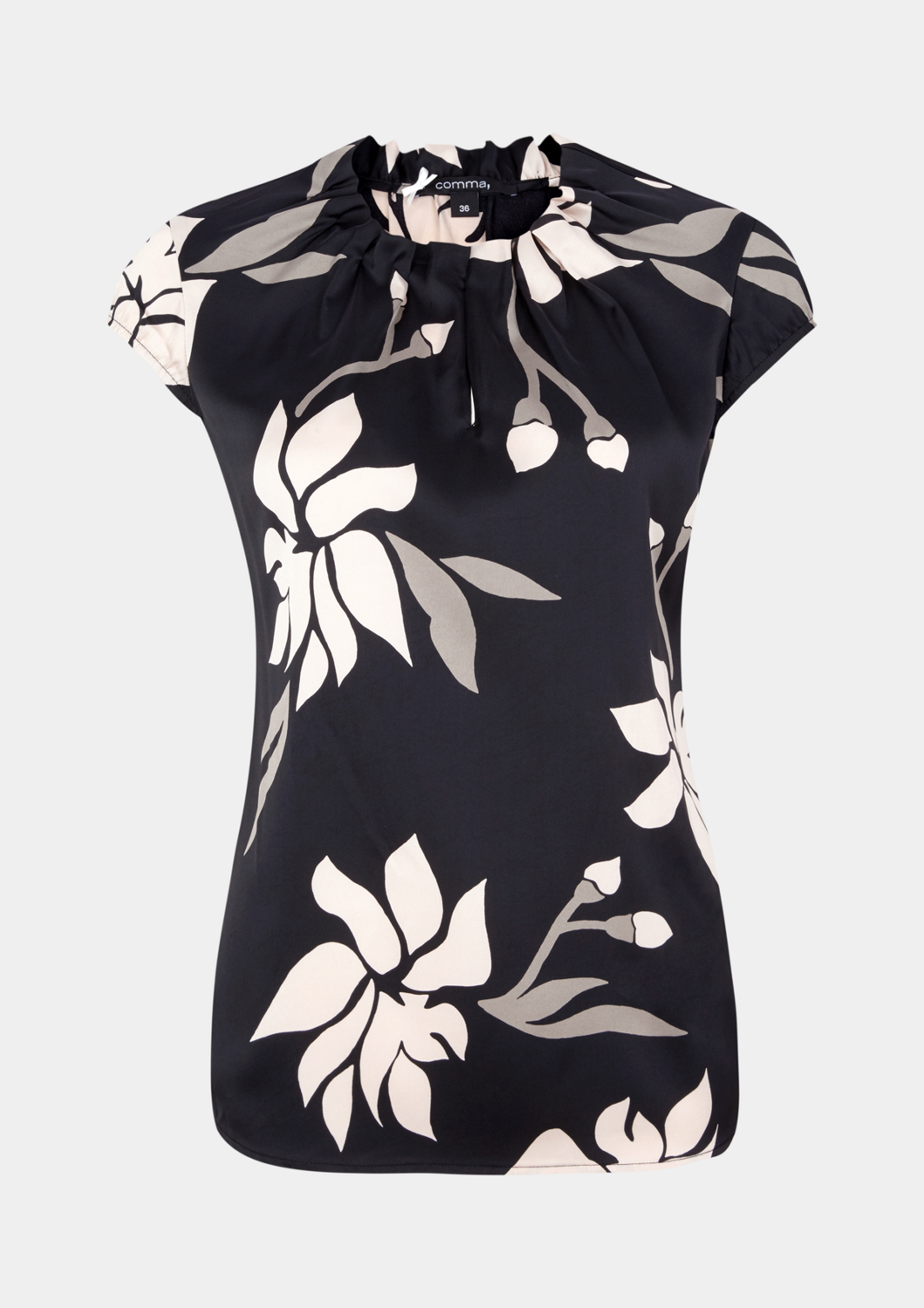 Kurzarmbluse aus Satin mit Alloverprint. Der Rundhalsausschnitt ist mit einem aufwendig gestalteten Faltenwurf verziert, Knopfverschluss und Zierschlitz vorn, Kappenärmel mit elastisch gerafften Säumen, schmal gesteppter und abgerundeter unterer Saum, liebevoll gestaltetes Allovermuster für einen besonders modischen Look, feminine, taillierte Passform; Rückenlänge bei Größe 36 ca. 60 cm, aus matt glänzenden und sanft fallenden Stoffqualitäten mit Elasthananteil